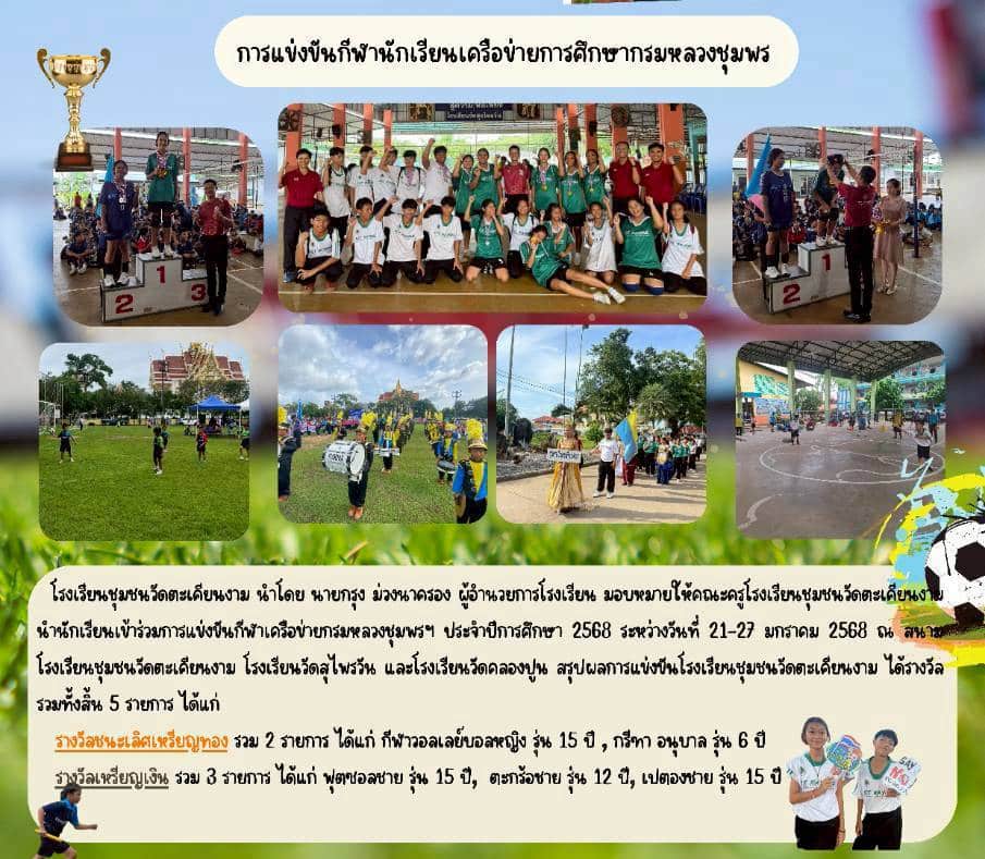 รงเรียนชุมชนวัดตะเคียนงาม นำโดย นายกรุง ม่วงนาครอง ผู้อำนวยการโรงเรียน มอบหมายให้ คณะครูโรงเรียนชุมชนวัดตะเคียนงาม นำนักเรียนเข้าร่วมการแข่งขันกีฬาเครือข่ายกรมหลวงชุมพร ประจำปีการศึกษา 2568 ระหว่างวันที่ 21-27 สิงหาคม 2568 ณ สนามโรงเรียนชุมชนวัดตะเคียนงามโรงเรียนวัดสุขไพรวัน และโรงเรียนวัดคลองปูน สรุปผลการแข่งขัน โรงเรียนชุมชนวัดตะเคียนงาม ได้รางวัลรวมทั้งสิ้น 5 รายการ