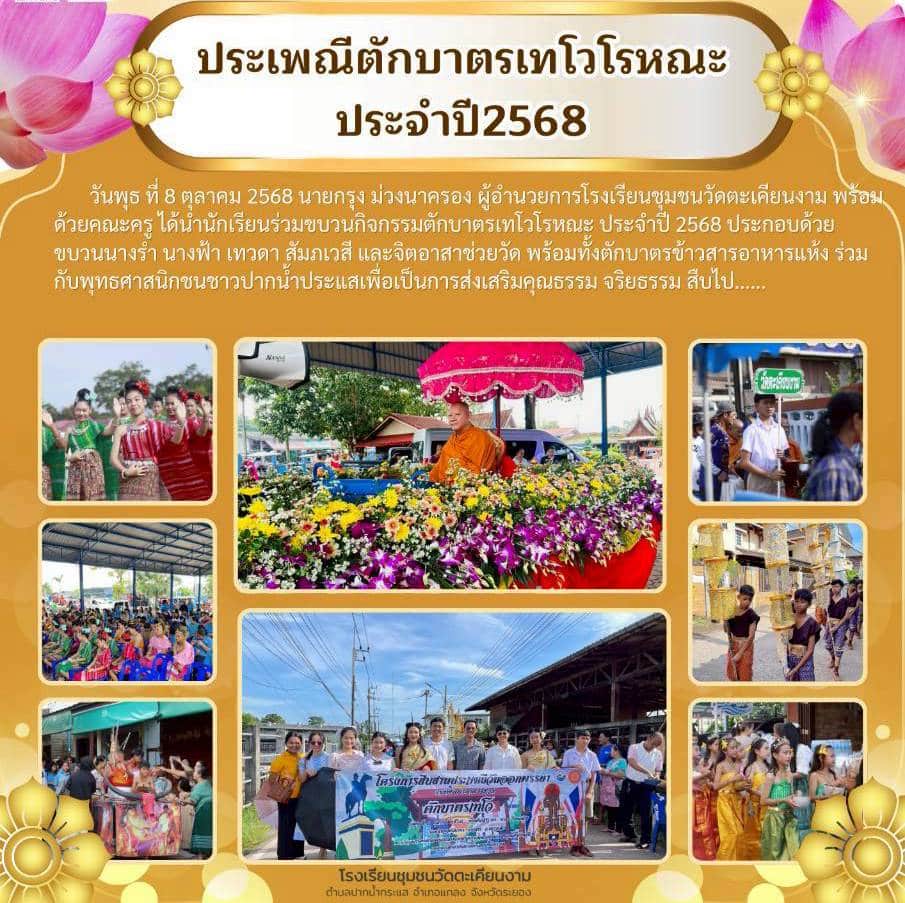 วันพุธ ที่ 8 ตุลาคม 2568 นายกรุง ม่วงนาครอง ผู้อำนวยการโรงเรียนชุมชนวัดตะเคียนงาม พร้อมด้วยคณะครู ได้นำนักเรียนร่วมขบวนกิจกรรมตักบาตรเทโวโรหณะ ประจำปี 2568 ประกอบด้วย ขบวนนางรำ นางฟ้า เทวดา สัมภเวสี และจิตอาสาช่วยวัด พร้อมทั้งตักบาตรข้าวสารอาหารแห้ง ร่วมกับพุทธศาสนิกชนชาวปากน้ำประแสเพื่อเป็นการส่งเสริมคุณธรรม จริยธรรม สืบไป