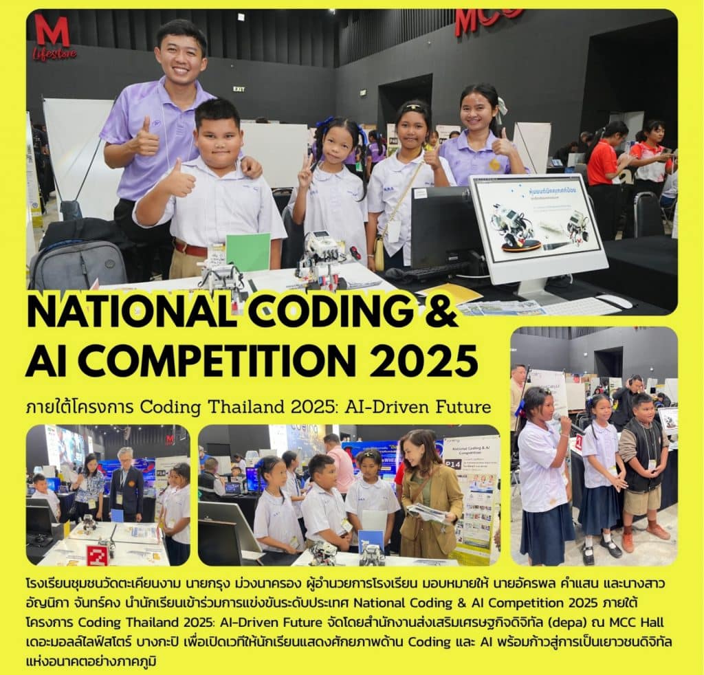 โรงเรียนชุมชนวัดตะเคียนงาม นายกรุง ม่วงนาครอง ผู้อำนวยการโรงเรียนชุมชนวัดตะเคียนงาม มอบหมายให้นายอัครพล คำแสน และนางสาวอัญนิกา จันนท์คง นำนักเรียนเข้าร่วมการแข่งขัน National Coding & AI Competition ภายใต้โครงการ Coding Thailand 2025: AI-Driven Future จัดโดยสำนักงานส่งเสริมเศรษฐกิจดิจิทัล (depa) ระหว่างวันที่ 3–5 ตุลาคม 2568 ณ MCC Hall ชั้น 3 เดอะมอลล์ ไลฟ์สโตร์ บางกะปิ กรุงเทพมหานคร