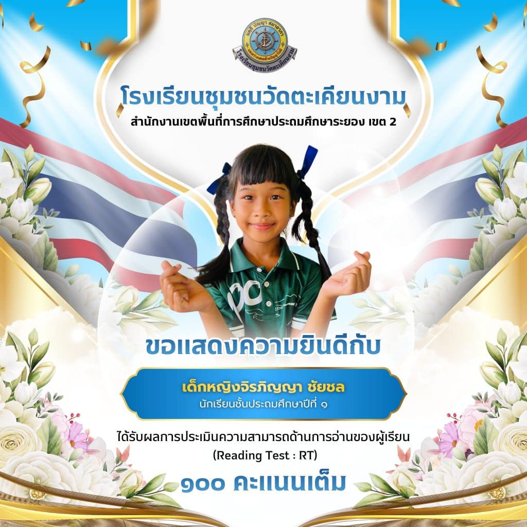 โรงเรียนชุมชนวัดตะเคียนงาม ขอแสดงความยินดีกับ เด็กหญิงจิรภิญญา ชัยชล นักเรียนชั้นประถมศึกษาปีที่ ๑ ได้รับผลการประเมินความสามารถด้านการอ่านของผู้เรียน (Reading Test : RT) ได้ ๑๐๐ คะแนนเต็ม